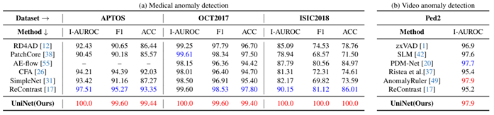 图3. 医学和视频异常检测数据集上与SOTA方法的比较结果