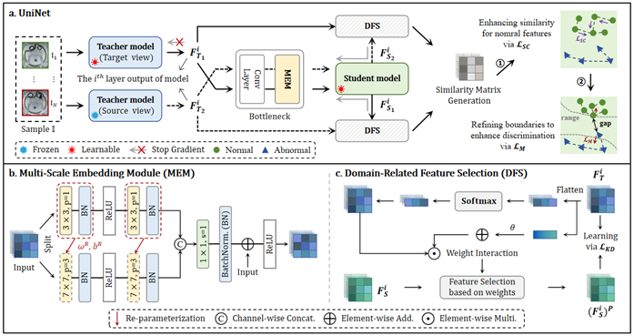 考虑到不同领域特征的差异可能限制异常检测的性能,UniNet采用了一种域相关的特征选择方法:首先,通过具备先验知识的教师模型生成特征,并据此生成局部权重,以决定选择多少域相关的重要信息。接着,为了增强感知能力,引入全局权重进行权重交互。最后,学生模型依据交互后的权重选择特征信息,并通过余弦距离最小化其输出与教师模型输出之间的差异。