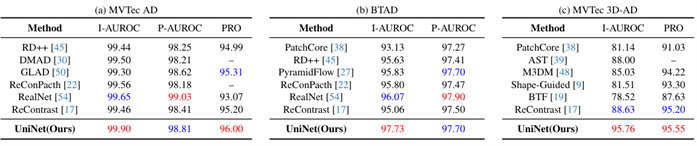 图2. 三个工业异常检测数据集上与SOTA方法的比较结果
