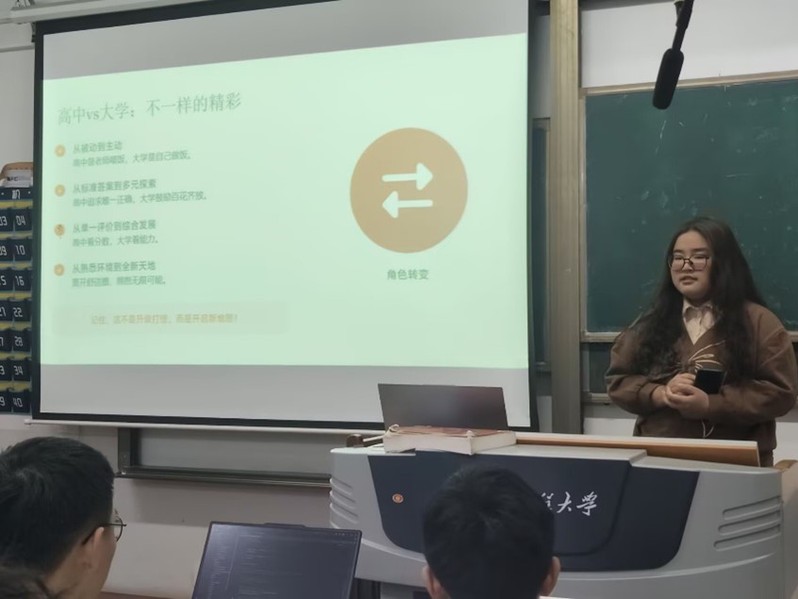 金兴燕围绕“破茧”“启程”两个关键词,为同学们带来了一份内容详尽的“高中至大学学生生活衔接指南”:她以自己的亲身经历为例,为学弟学妹们剖析了高中学习与大学学习的区别,指出大学的学习相较于高中阶段对同学们提出了更高的要求,建议大家始终保有主动探索的兴趣,不断提升自主规划的能力,打开视野,拥抱新知识、新学科,注重自身综合能力的发展。此外,她还就参与学生工作、参加社团活动、投身竞赛科研等同学们普遍关注的内容进行了解答,并对“调整心态”这一问题与学弟学妹们分享了自己的感受,鼓励大家“勇于试错”,因为“大学四年是一场马拉松,而不是百米冲刺,坚持到最后才是胜利!”