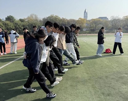 紧接着,巨人脚步、蒙眼互打、急速三子棋、不倒森林等多个趣味项目轮番上阵:“巨人脚步”中,八人九足踏出同款节奏,踉跄处一把搀扶,跌倒后一句“没事”,让“一二一”越喊越齐;“蒙眼互打”赛场充满欢声笑语,蒙眼的选手们凭借听觉和触觉寻找目标,闪躲、出击的模样引得围观同学阵阵喝彩;“急速三子棋”则是脑力与速度的双重比拼,选手们既要快速布局,又要严防对手落子,每一步决策都牵动着团队的心;“不倒森林”考验着大家的专注力与协作力,同学们手持立杆保持平衡,在节奏变化中相互呼应,始终坚守着“责任接力”的目标。赛场内外加油声、欢呼声、笑声此起彼伏,紧张而热烈的氛围感染着每一位2025级新生。