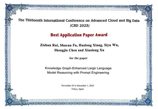 近日,软件学院2024级研究生芮子舜在国际会议The International Conference on Advanced Cloud and Big Data (CBD)上发表了题为“Knowledge Graph-Enhanced Large Language Model Reasoning with Prompt Engineering”的研究论文,并荣获最佳应用论文奖(Best Application Paper Award),指导老师为我院许小龙教授和江苏省气象台陈圣劼博士。该研究针对知识库问答任务中大型语言模型存在的知识局限性和幻觉问题,提出了一种知识图谱增强的提示工程推理框架(LRwP)。该框架通过优化子图检索和设计多阶段推理机制,将知识图谱的结构化信息与大模型的推理能力相结合,在显著提升推理准确率的同时,保持了过程的可解释性。